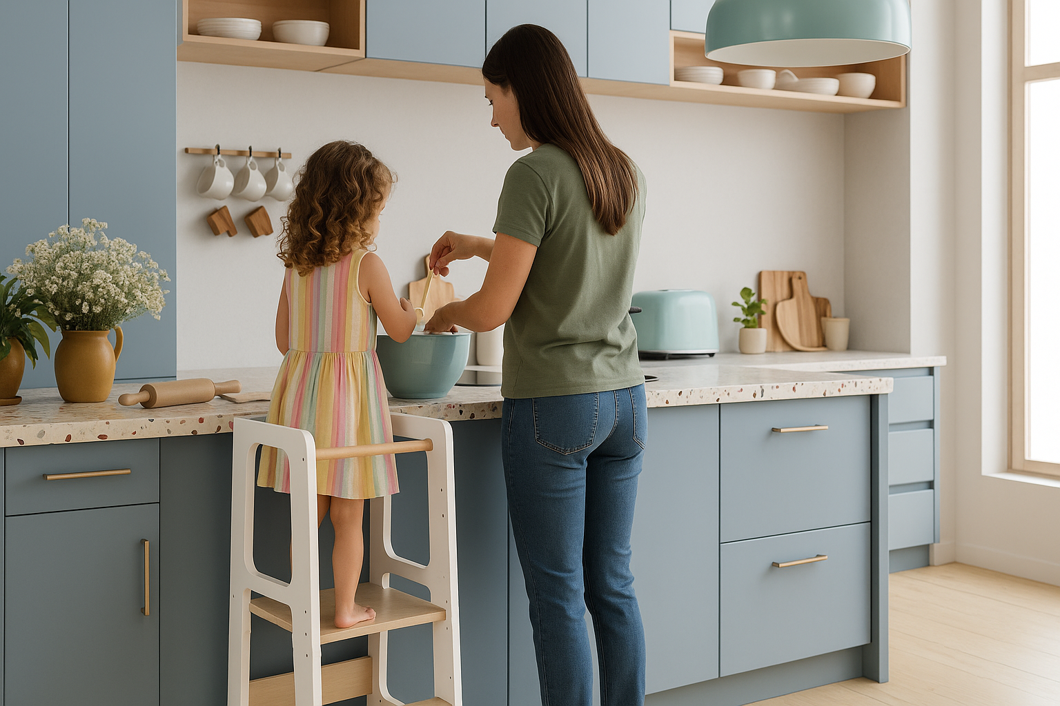 Descubre todas las actividades que tu hijo puede hacer con una torre aprendizaje Montessori: cocinar, pintar, jugar y aprender con autonomía y diversión.