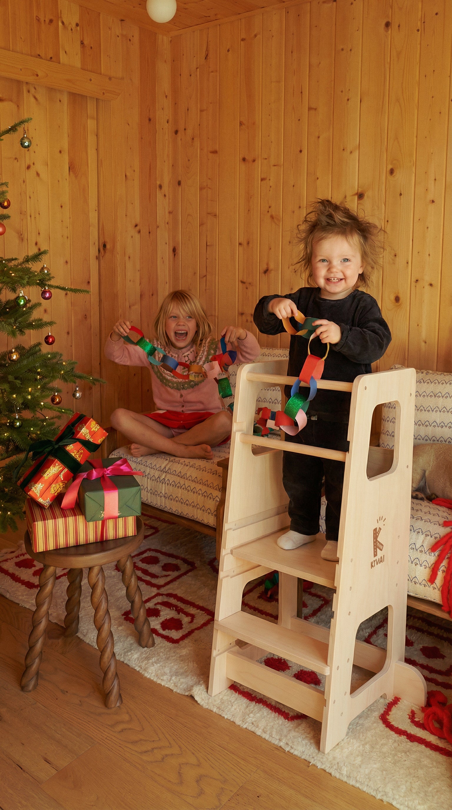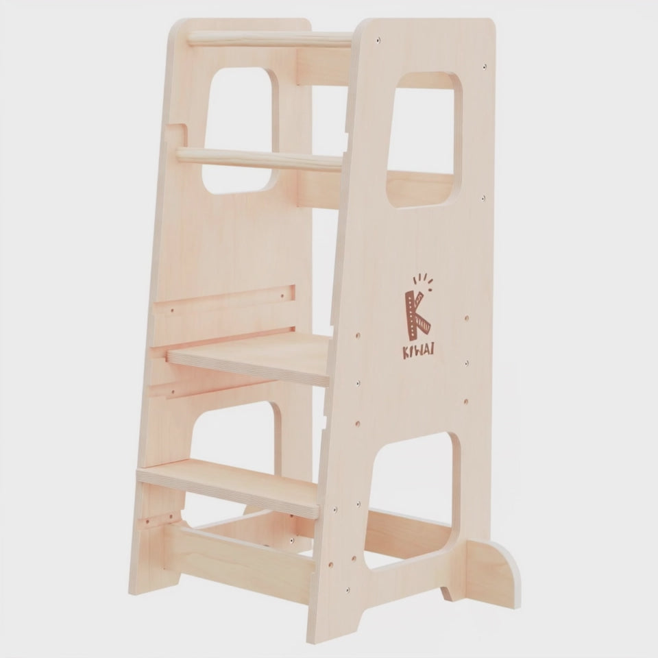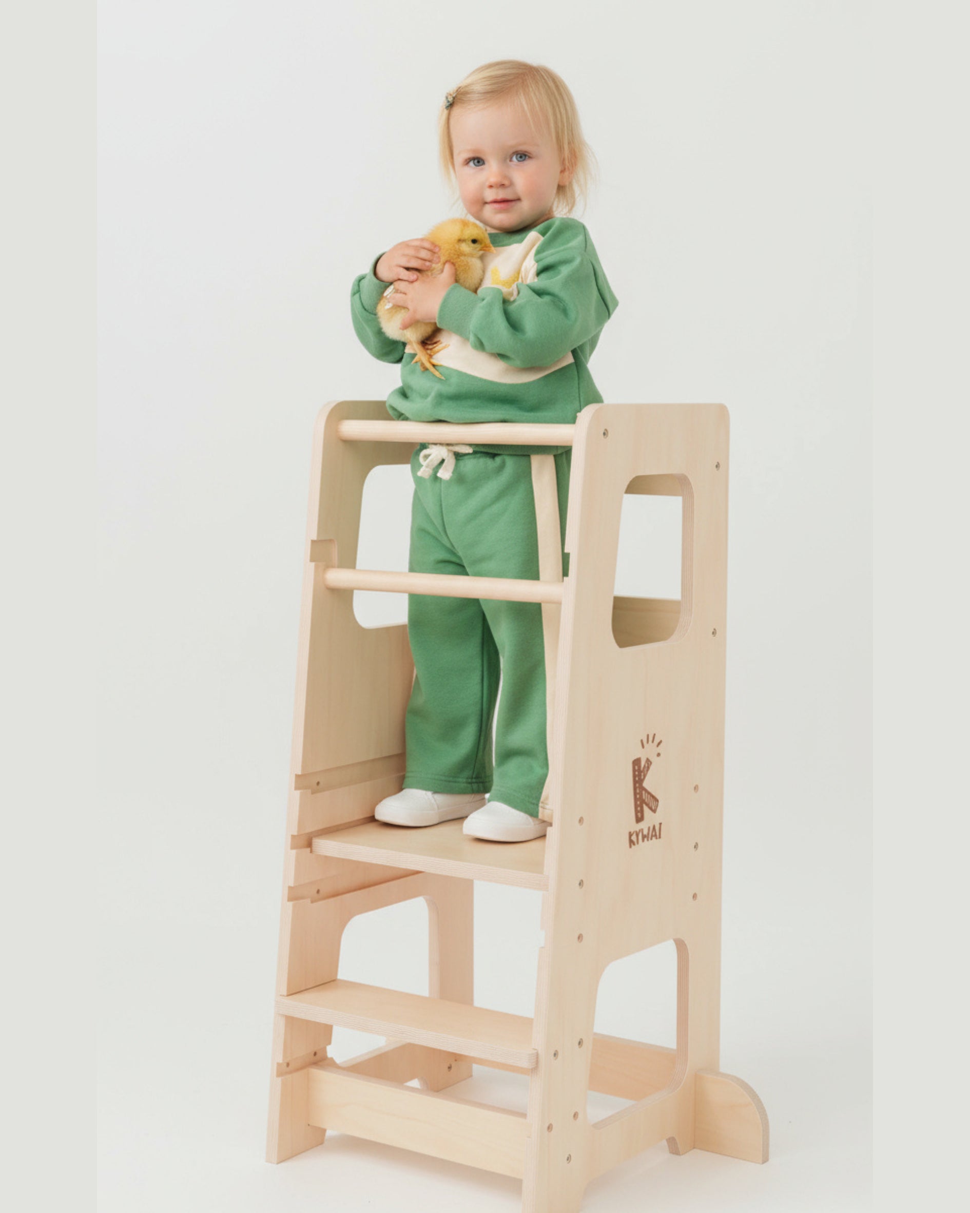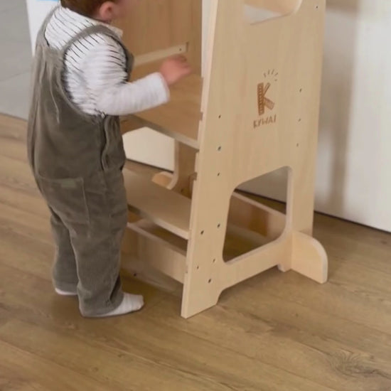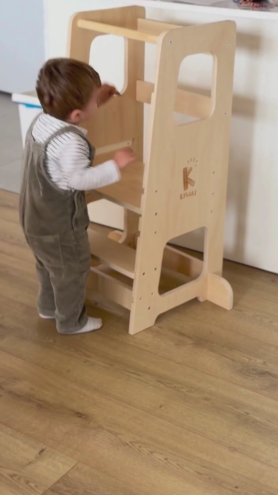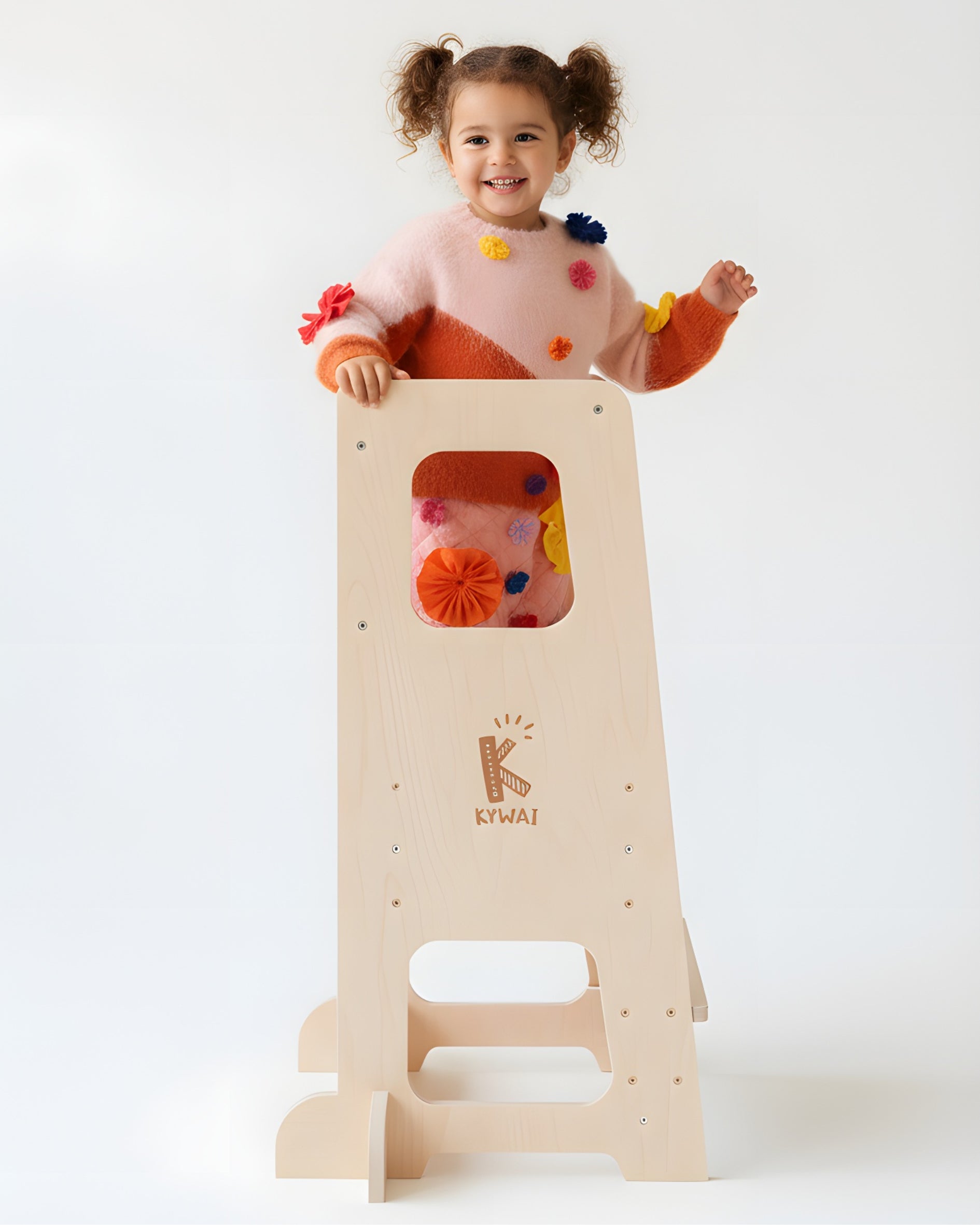Gracias a sus estantes regulables en altura, la torre acompaña el crecimiento de los niños, desde sus primeros pasos hasta que alcanzan la encimera de la cocina o el fregadero del baño. Con barandillas de seguridad y una base estable, podrán explorar, aprender y divertirse con total confianza.